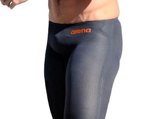 Here are two photos of the legal Arena swimsuit. Notice the bright orange Arena logo. This is the distinguishing mark of the legal and non-legal suit. If the logo is white or any other color, the suit is not legal.