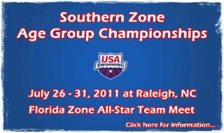 The final roster for the Florida Zone All-Star Team has been released. The team wil travel to Raleigh, NC to compete in the Southern Zone Age Group Championships on July 26-31, 2011. More details soon. The Open Water Release Form has also been posted and must be submitted by each swimmer online. Check the Zone Team page for more information here.