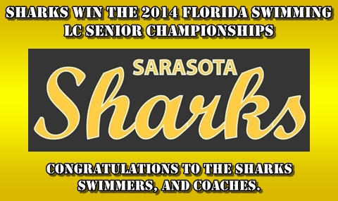 Sarasota Sharks are the team champions of the 2014 LC Senior Champs held at Ft. Pierce, FL on July 24-27. Top 5 Teams: 1 Sarasota YMCA Sharks 1,794 2 Blue Dolfins 957 3 Area Tallahassee Aquatic Club 874.50 4 Bolles School Sharks 691.50 5 Lakeland Area Swimming 460 Individual High Point Winners: 15-16 Girls - Patrice, Grace 15 Sarasota YMCA Sharks-FL 116 15-16 Boys - Poti, Zachary 15 Blue Dolfins-FL 102 Senior Girls - Atkins, Alexandra 17 Sarasota YMCA Sharks-FL 87 Senior Boys - 1 Pelton, John 18 Sarasota YMCA Sharks-FL 86